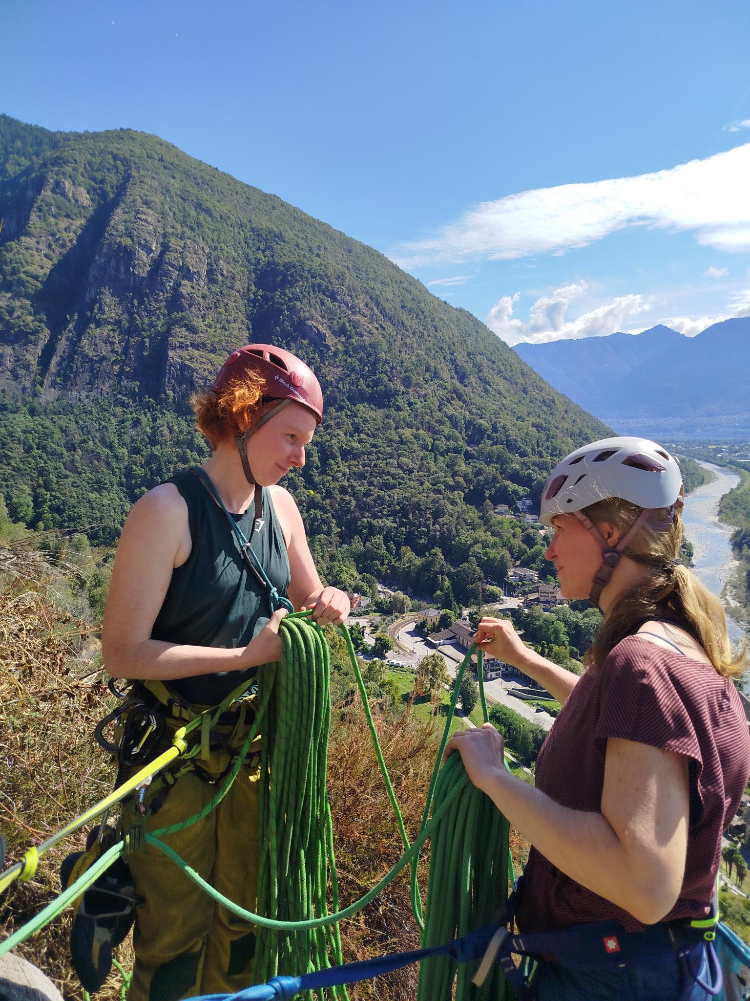 Mittwoch ist es dann soweit: wir haben zwei Tage lang fleißig geübt, Stände gebaut, Seile hoch oben in der Wand entwirrt — die Abläufe sitzen. Heute soll es in die erste richtige Mehrseillänge gehen! Schon am Tag davor haben wir die Route geplant und durchgesprochen, das Wetter gecheckt und einen Rucksack gepackt mit dem Nötigsten, den wir mit hoch nehmen werden. Leider ist eine von uns am Morgen zu krank um mitzukommen. Zwar kann man auch zu dritt eine Mehrseillänge klettern, das erfordert aber eine andere Sicherungstechnik, die wir bisher nicht geübt haben. Hoch wollen wir trotzdem. Deswegen klettert Theresa, unsere Trainerin, alle fünf Seillängen vor und sichert uns anderen beiden von oben nach. Aufregend genug ist es trotzdem! Nach gut drei Stunden haben wir es alle drei nach oben geschafft. Von hier sieht man weit am Fluss entlang bis hinunter zum Lago Maggiore. Ganz schön respekteinflößend so eine 150m hohe Felswand!